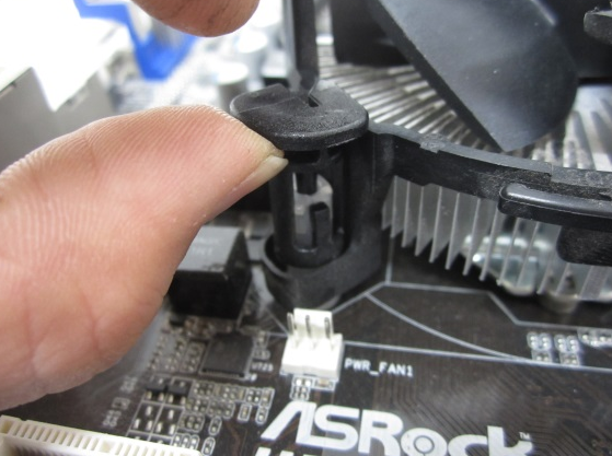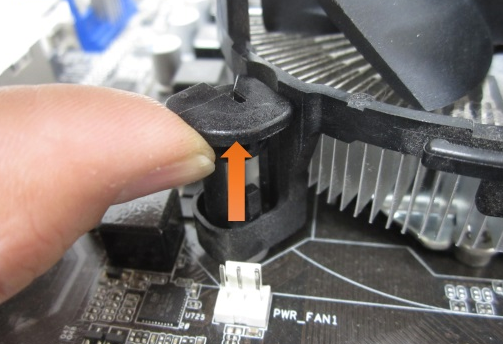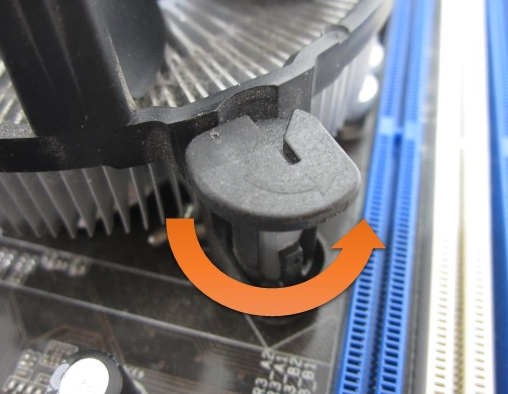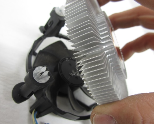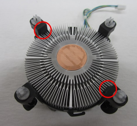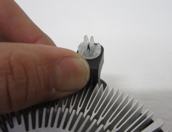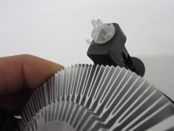 고정부 양 끝쪽에 보면 히트파이프와 팬 이 조립되어 이를 고정하는 플라스틱이 보일 것이다.