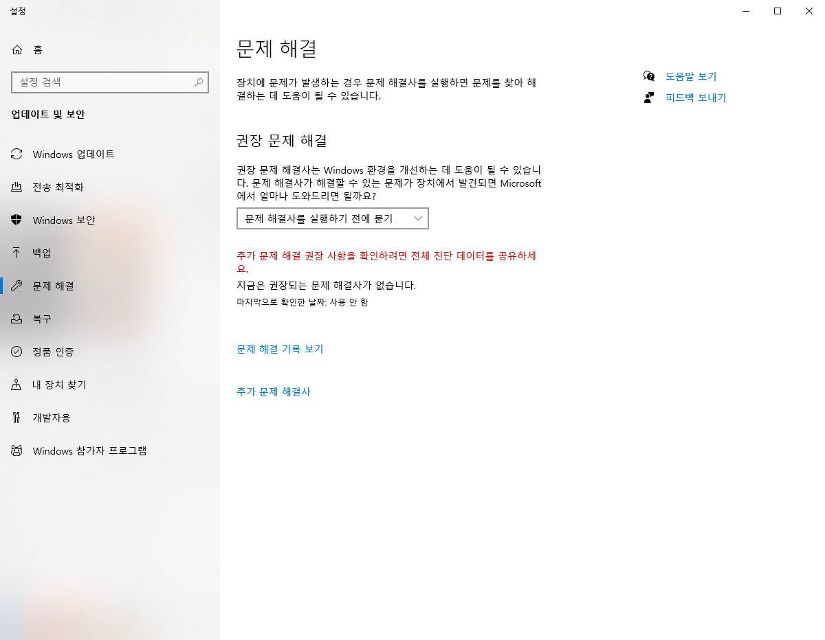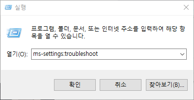 윈도우버튼 + R 의 단축키를 누르고 ms-settings:troubleshoot를 입력한다