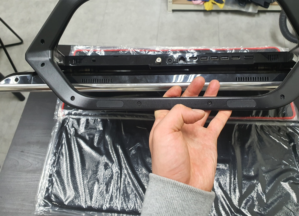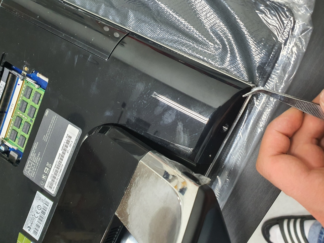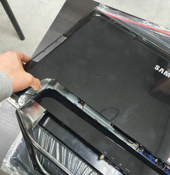 뒷판을 해체하기 위하여 모니터를 바닥에 깔아야 하니 아래에 받침으로 사용할만한 쿠션을 대어주도록하자.
