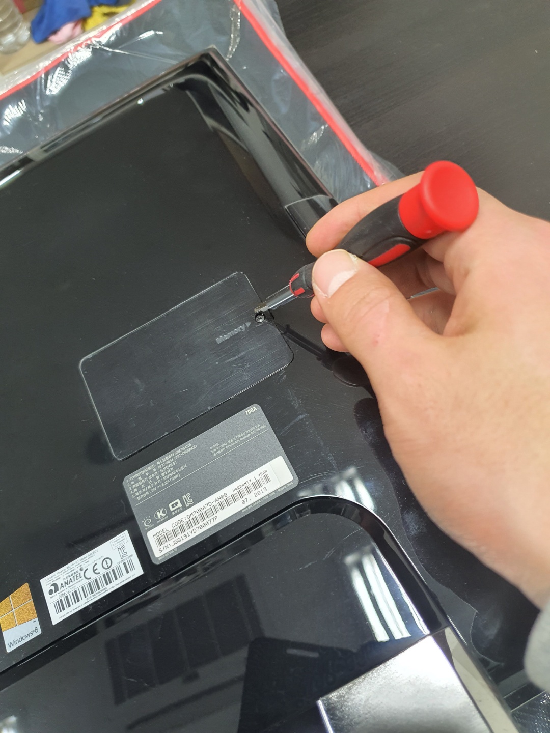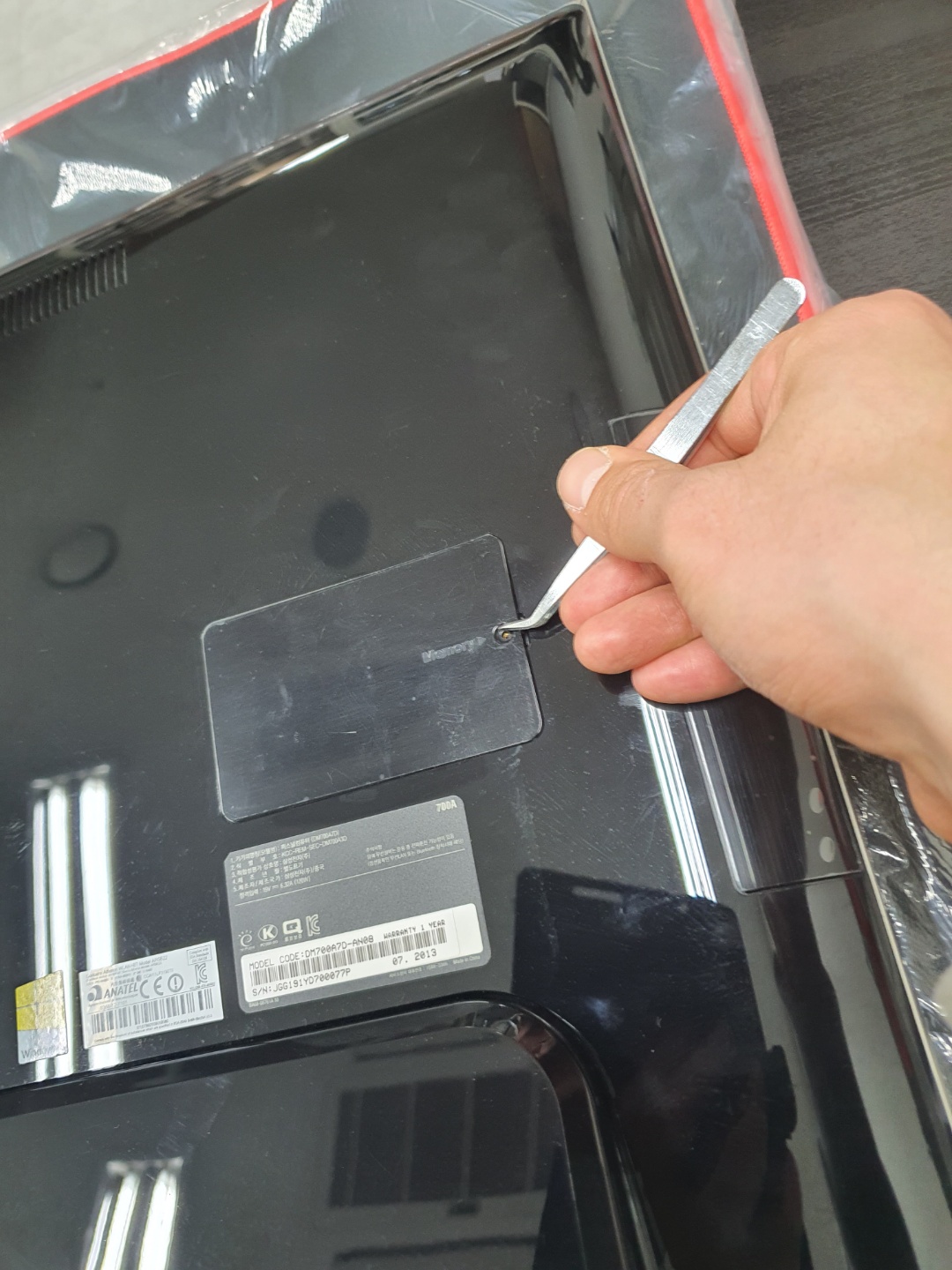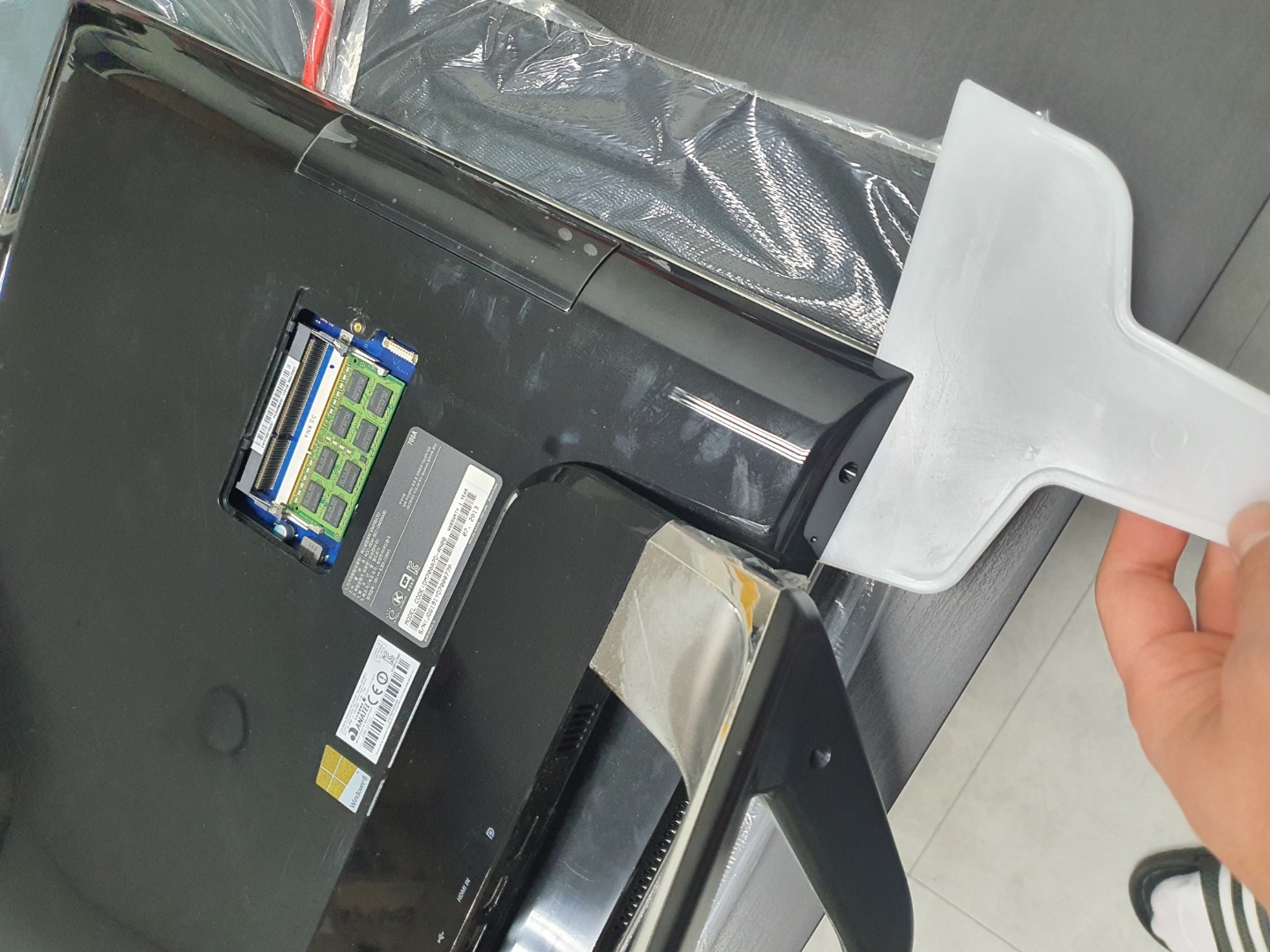 SSD로 교체하기위해서는 기존에 장착되어있는 하드를 제거하여야 한다, 제거하기 위해서는 뒷판을 뜯어내야 하는데 우선 메모리 슬롯부터 안전하게 뜯어주도록하자, 삼성제품의 특징은 메모리를 사용자가 손쉽게 교체할 수 있도록 슬롯이 따로 빠져나와 보통 따로 덮개형태로 덮혀있다.