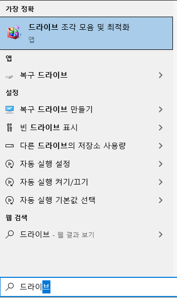 윈도우키를 눌러 "드라이브 조각" 검색한 뒤 드라이브 조각 모음 설정 화면으로 이동한다.