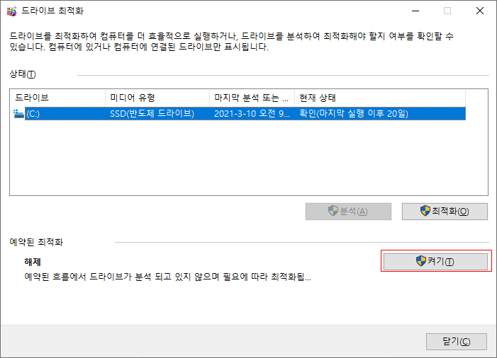 위의 네모에 켜기 버튼이 보인다면 설정되지 않은 것이고, 설정 변경 버튼이 보인다면 설정을 해제하여 SSD는 예약 최적화 기능을 사용하지 않도록 설정하자.
