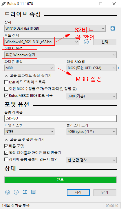 굽기 전, 반드시 ISO파일이 32비트인지 꼭 확인하여야 하고, 파티션 방식을 MBR로 설정해 주어야 한다.