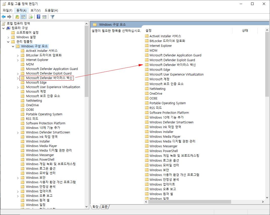 로컬 컴퓨터 정책 -> 컴퓨터 구성 -> 관리 템플릿 -> Windows 구성요소 -> Microsoft Defender 바이러스 백신 이동