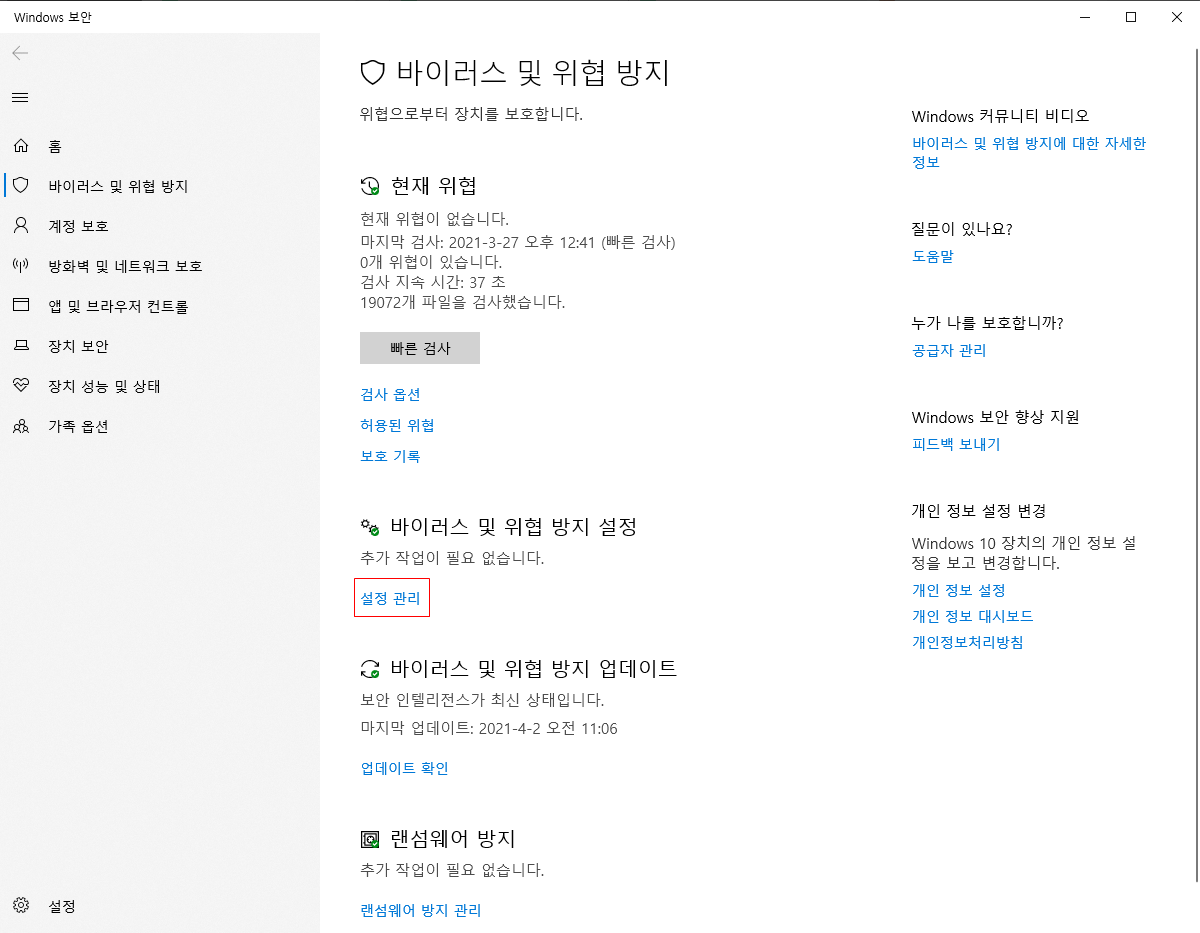 설정 창에서 바이러스 및 위협 방지 설정 -> 설정 관리 항목 선택