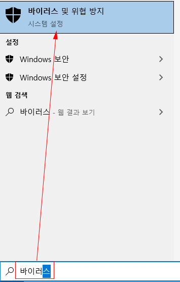 윈도우 키를 눌러 "바이러스 및 위협방지" 검색