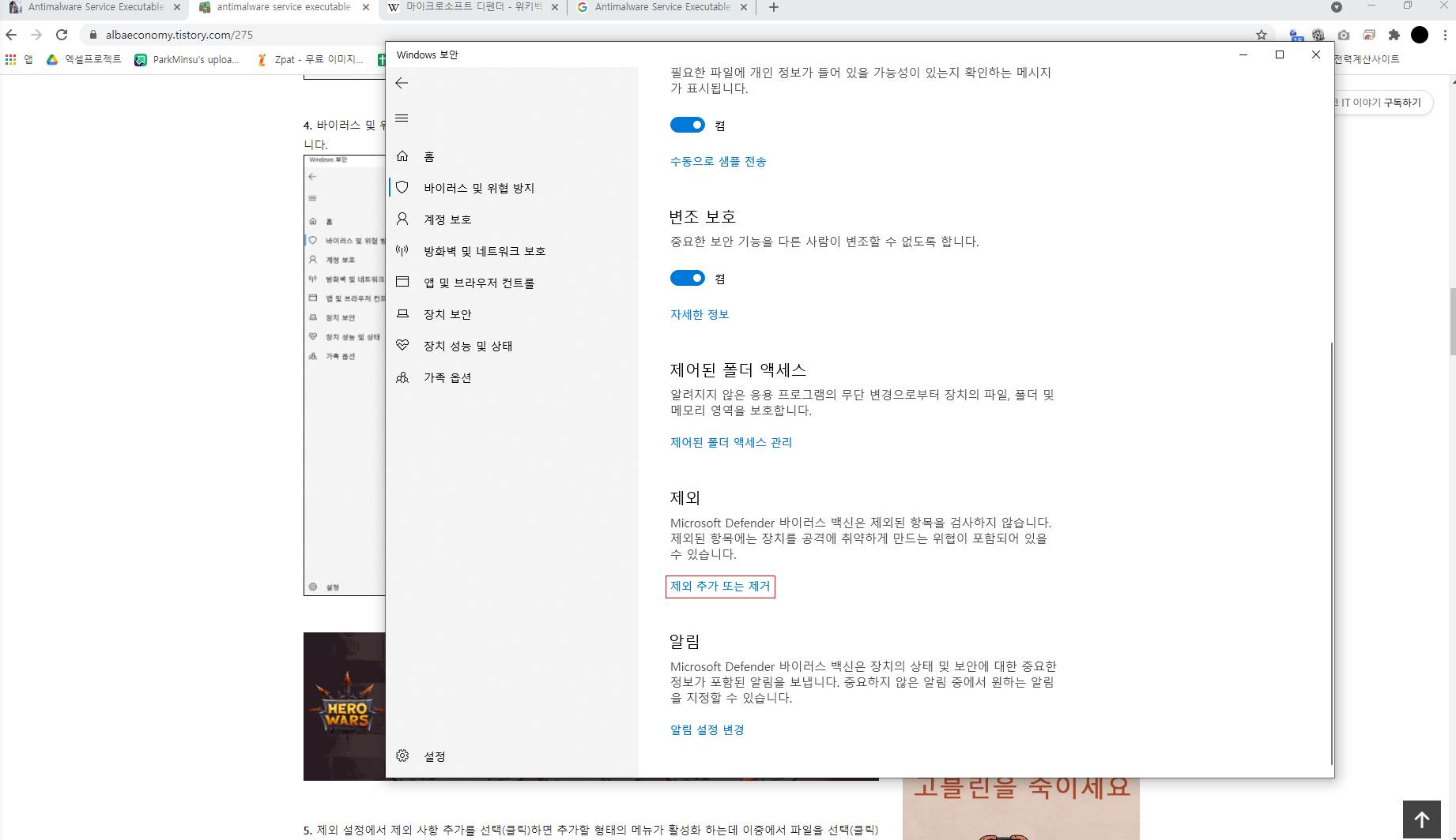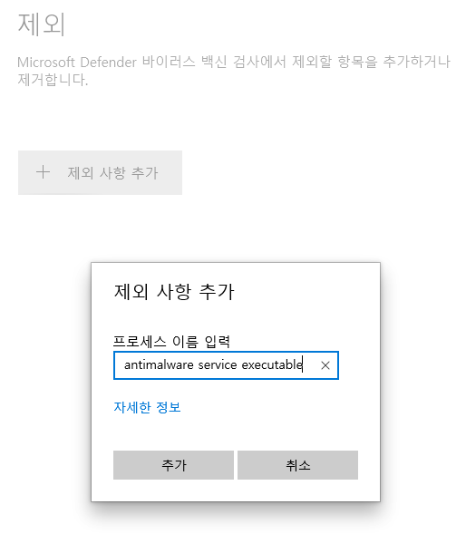 Antimalware Service Executable 동작 프로세스 및 파일 예외 설정