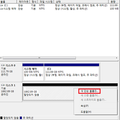 디스크 1 의 우클릭하여 "새 단순 볼륨" 을 할당 해주면 끝이다.