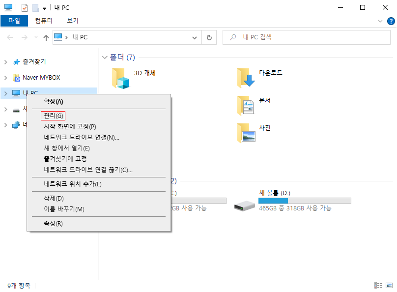 내 PC -> 우클릭 "관리(G)" 선택
