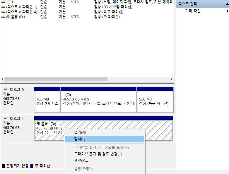 파티션 명령어로 초기화 하는 방법도 있지만, 윈도우로 부팅한 상태에서 간단하게 처리하는 방법은 아래와같다.