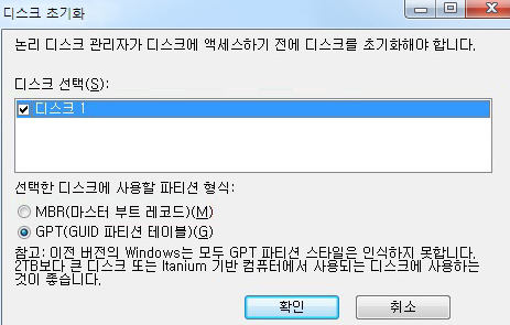 GPT 파티션을 선택한 뒤, 확인