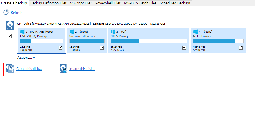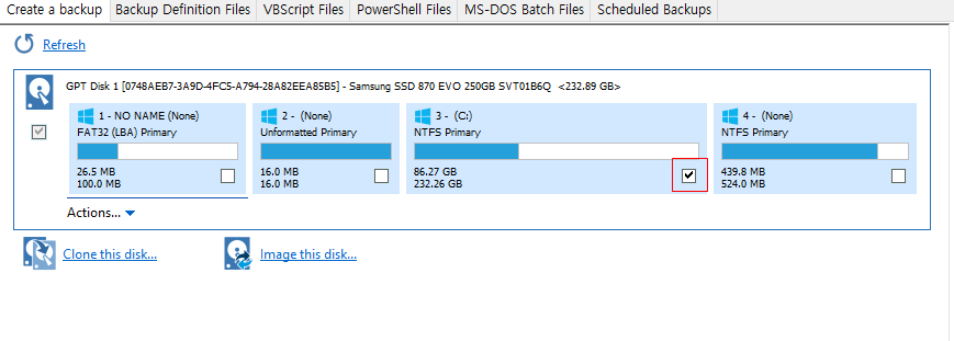 이때 전부를 선택할 수 있고, 특정 파티션만 선택하여 클로닝이 가능한데, 위의 체크박스를 선택하여 진행하면 되겠다.