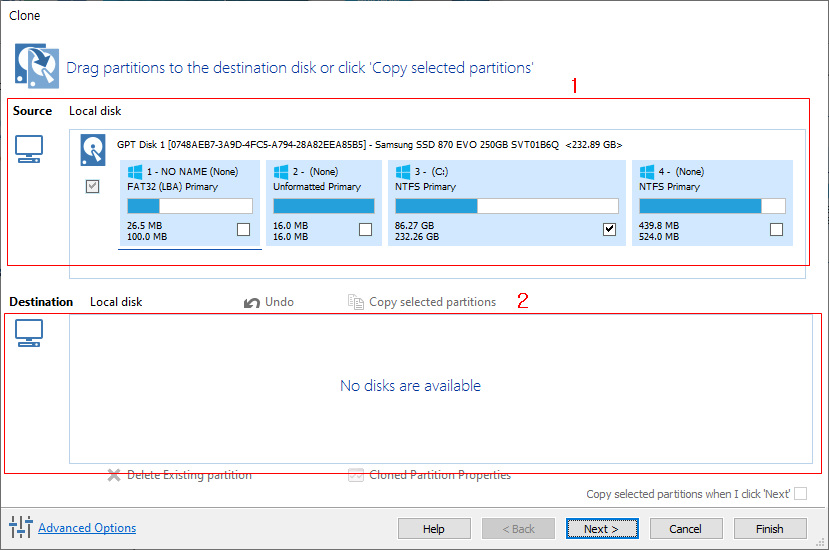 2번의 경우 복사를 시작할 새로운 새 디스크로 선택후, Next를 눌러 진행하게된다면 동일하게 파티션만 복사하게 된다