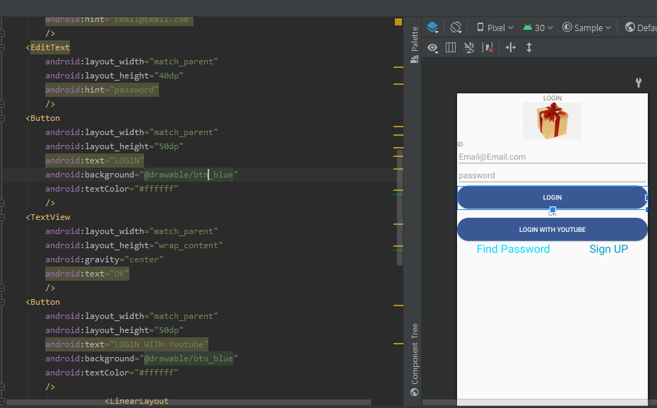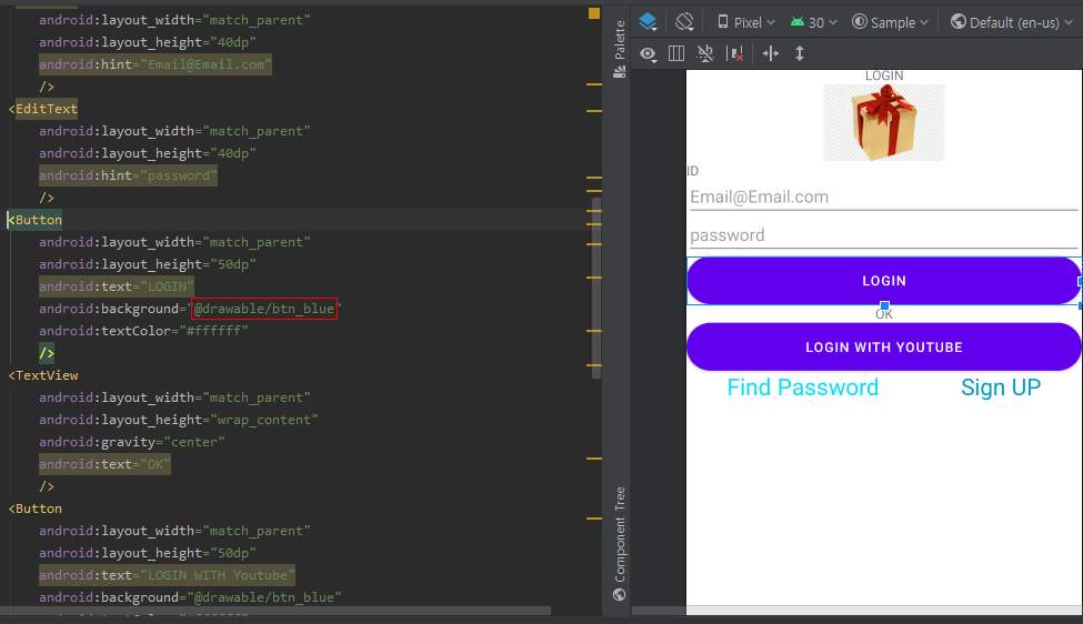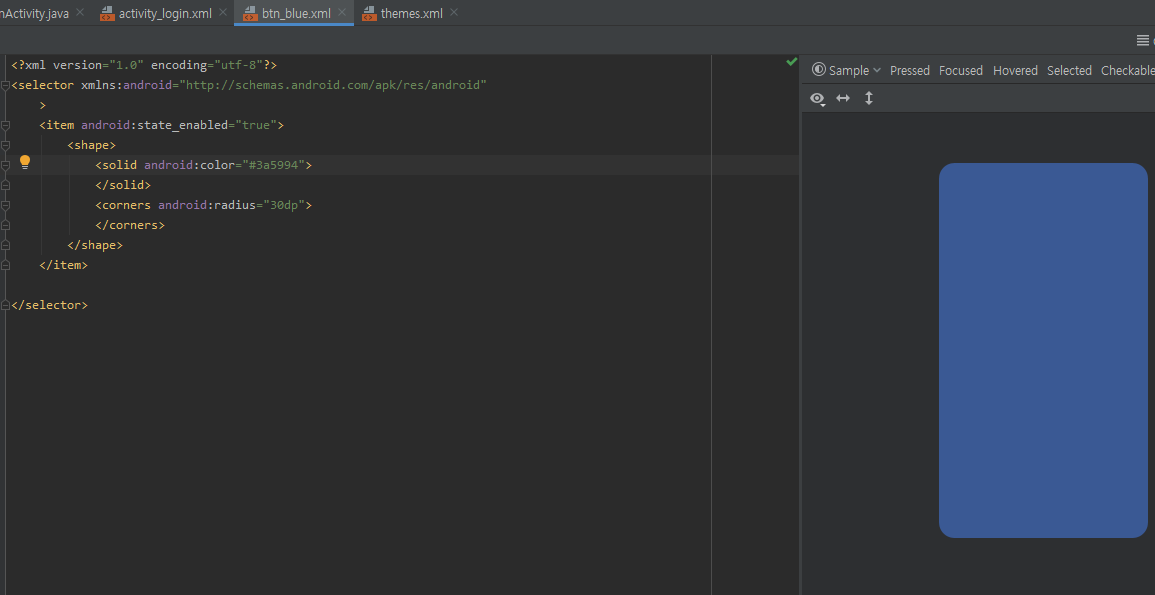 위와같이, bt_blue.xml 을 만들어 색상을 #3a5994 색상으로 변경한 뒤,