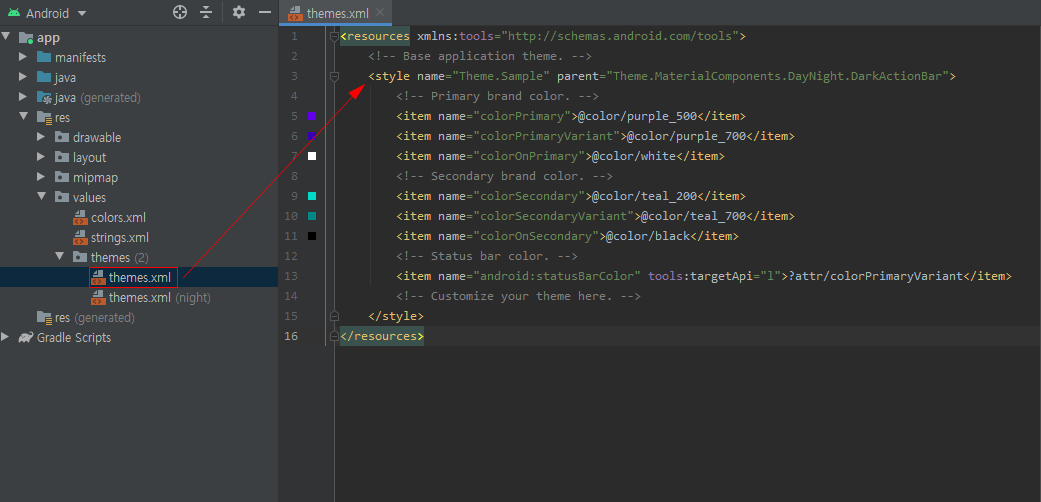 <style name="Theme.Sample" parent="Theme.MaterialComponents.DayNight.DarkActionBar">