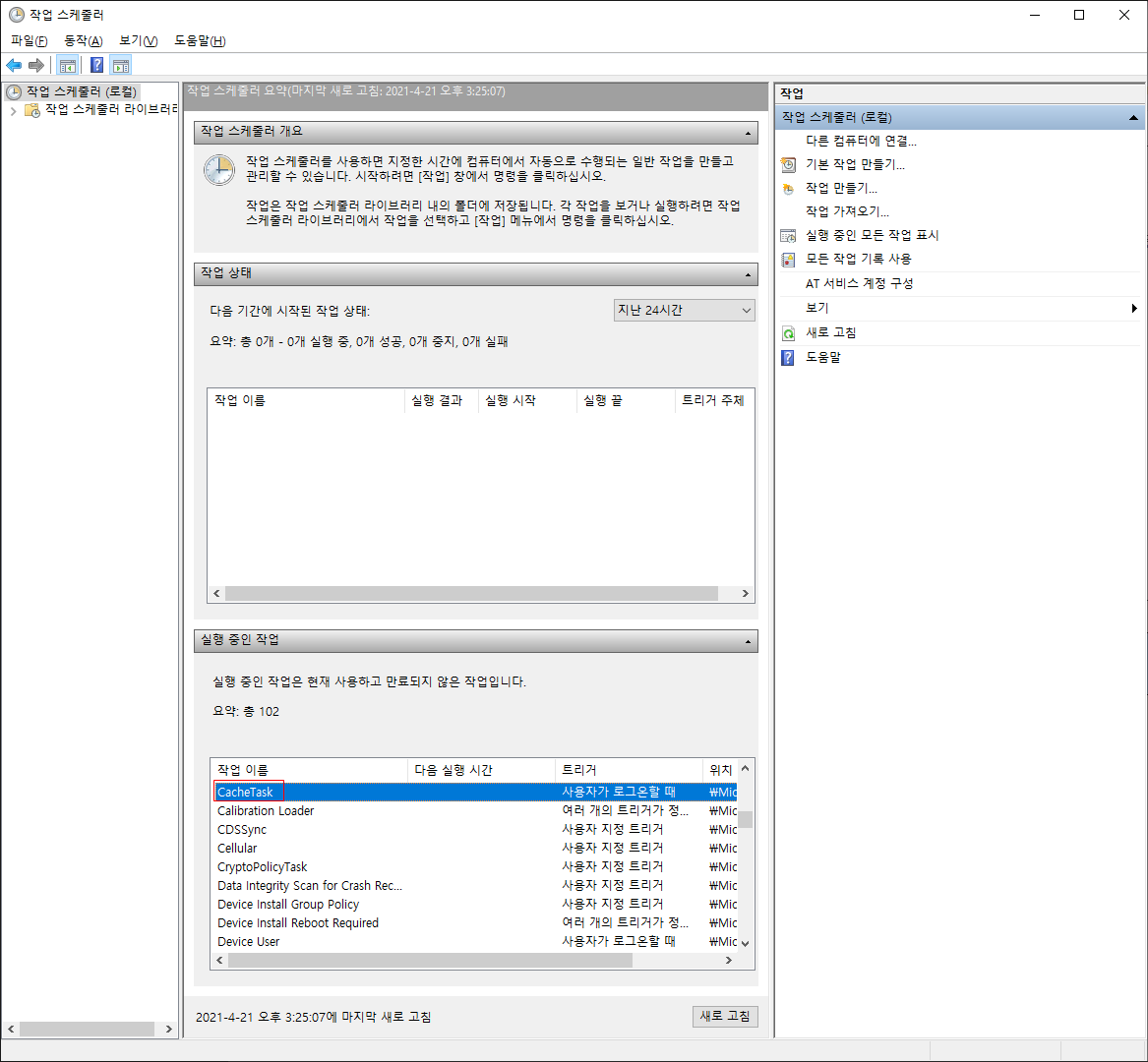 실행 중인 작업 탭 에서 CacheTask 항목 더블클릭