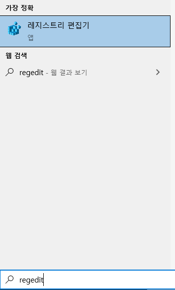 윈도우 키를 눌러 "regedit" 를 입력 후, 레지스트리 창을 열어 준다.