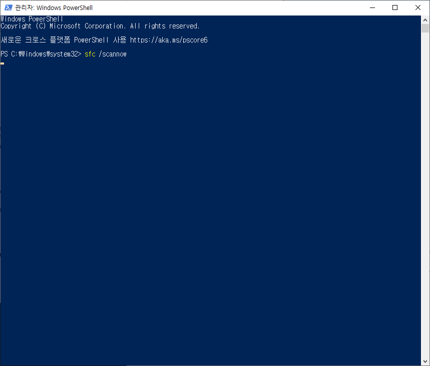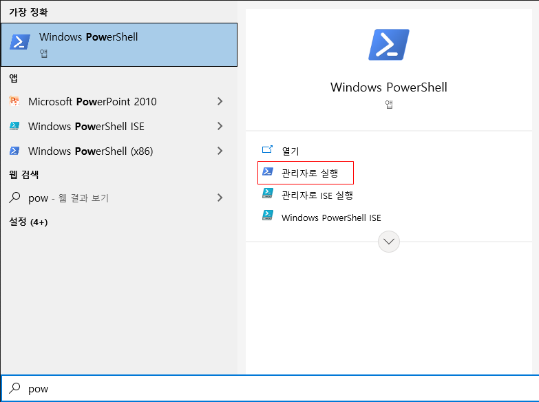 윈도우 키를 눌러 powershell 을 입력하여 Windows PowerShell을 관리자 권한 으로 실행 한다.