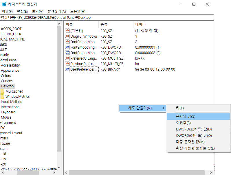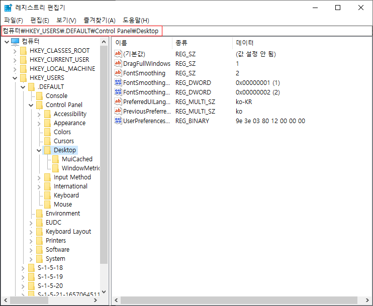 컴퓨터\HKEY_USERS\.DEFAULT\Control Panel\Desktop