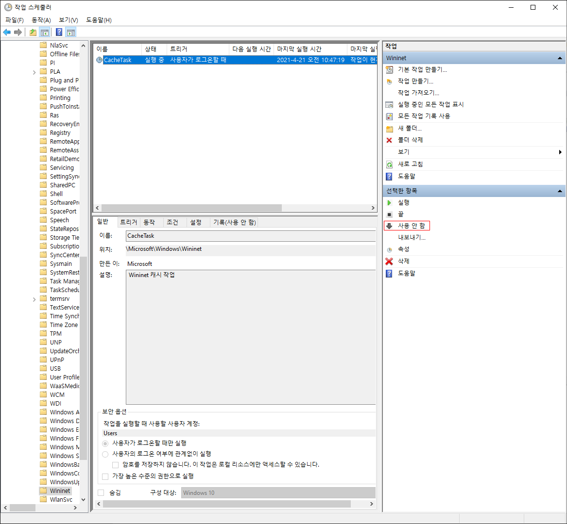 스케줄러에서 실행 된 TaskCache 를 실행 종료 하는 방법으로 TaskCache는 지정된 시간에 Task를 담당하는 프로세스를 실행하는 역할로 해당 서비스가 스케줄러에 등록되어 있어 문제가 되는경우 이다.