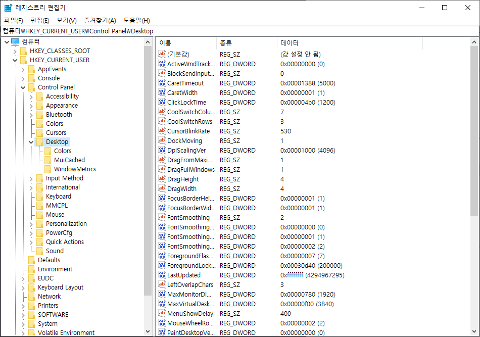 컴퓨터\HKEY_CURRENT_USER\Control Panel\Desktop