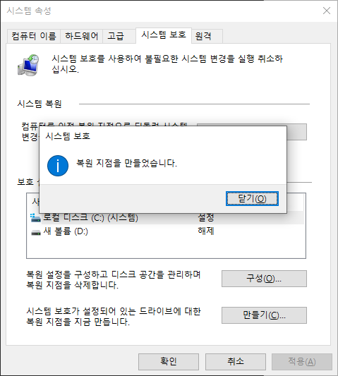 복원 지점을 만들었습니다.