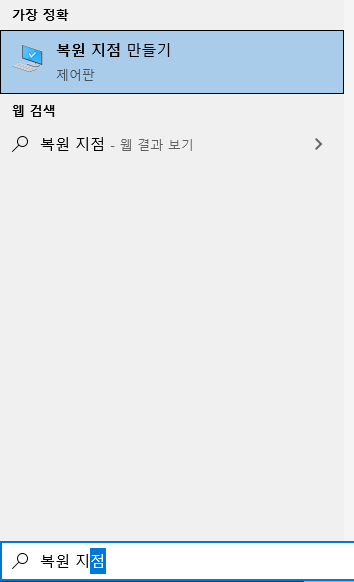 윈도우키를 눌러 "복원 지점" 이라고 검색 한다.