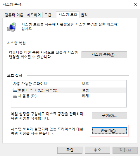 시스템 보호가 설정되어 있는 드라이브브에 대한 복원 지점을 지금 만듭니다. - 만들기(C) 선택