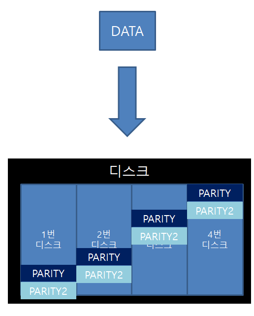 RAID 5 와 비슷한 형태를 가지고 있지만 디스크에 2차 패리티 구성을 포함하여 디스크가 2개 손상되어도 복구가 가능한 형태가 되겠다, 2개의 패리티를 사용하므로 최소 4개의 디스크를 구성해야 하며 RAID 5 보다 더 높은 안정성을 자랑한다, 단순히 RAID 5 보다 복구할 디스크의 갯수가 하나 더 늘어났다고 보면 되겠다.