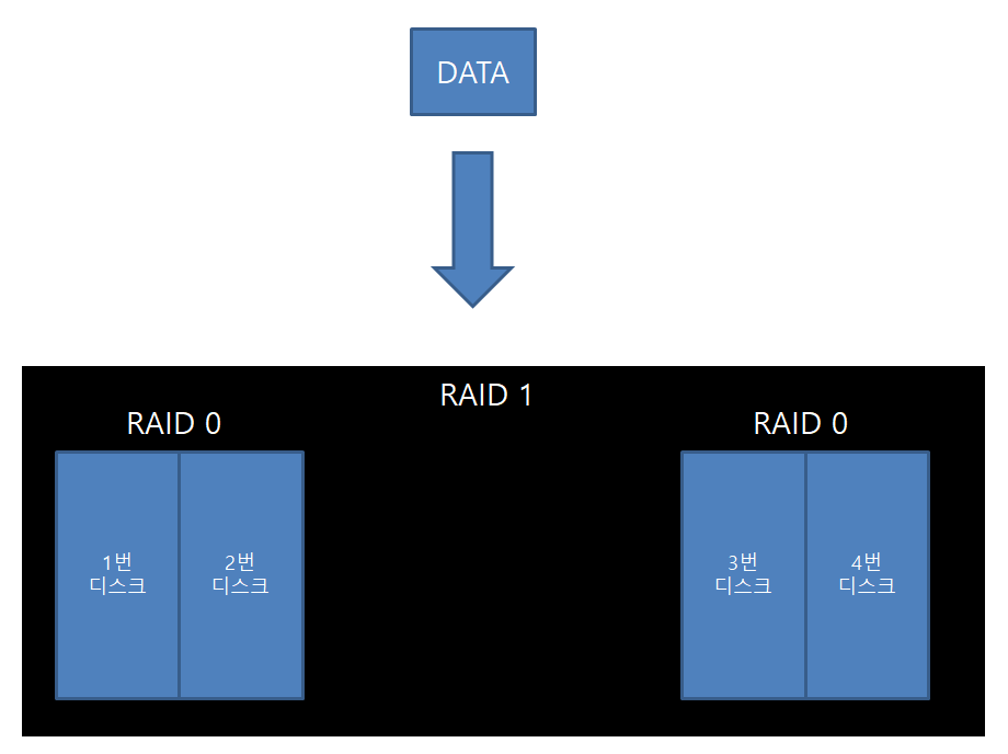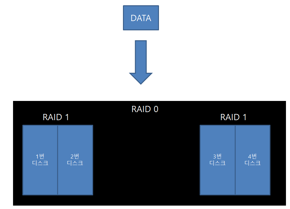 RAID 0 으로 먼저 묶은 뒤, RAID 1로 구성하여 미러링을 구성하는 형태로 구성된다