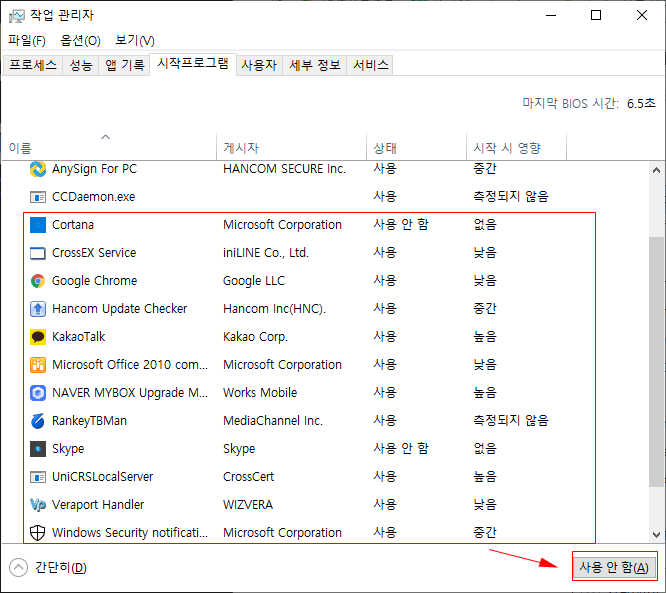 위의 각 항목들을 선택하여 사용안함으로 변경 하도록 한다.
