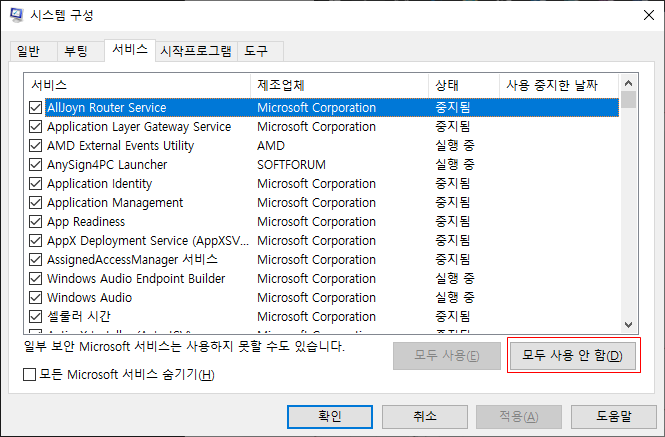 시스템 구성 -> 서비스 -> 모두사용안함 선택