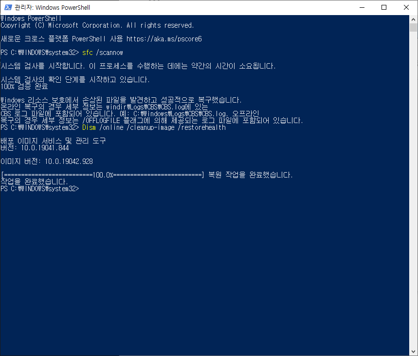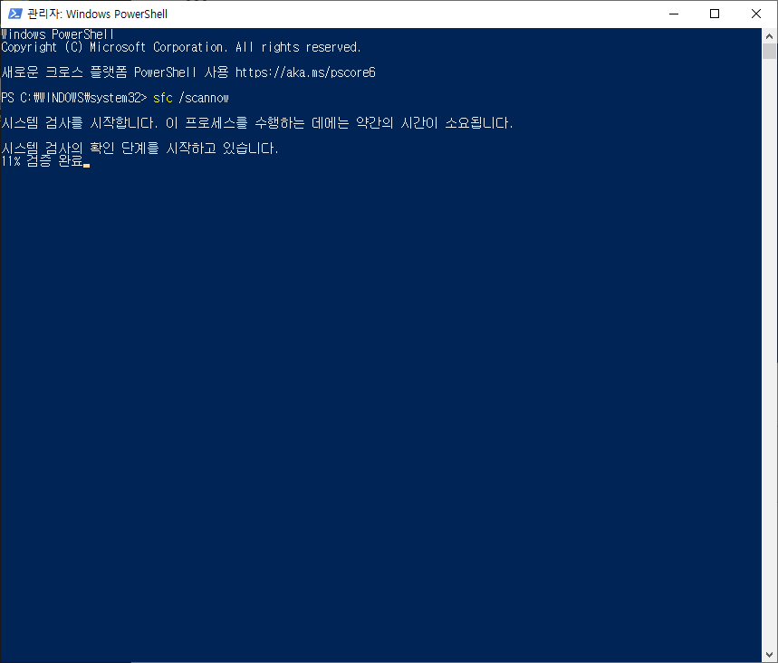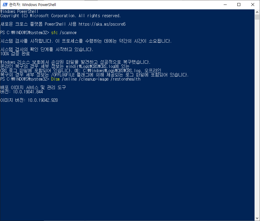 마이크로소프트 사 에서 안내된 내용으로 명령 프롬프트를 통해 시스템 검사를 진행하여 오류를 해결 할 수 있다.