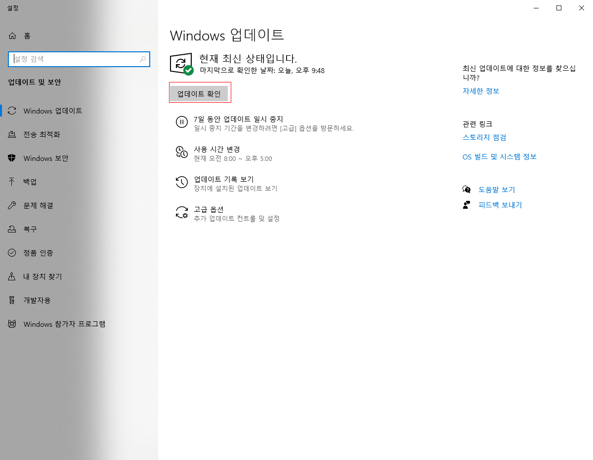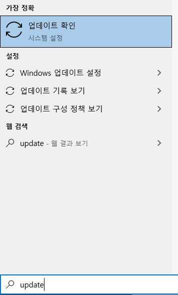윈도우 키를 눌러 "update" 입력 후, 업데이트 관리화면으로 이동한다.