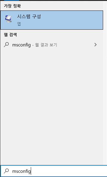 윈도우 키를 눌러 "msconfig" 또는 "시스템 구성" 입력하여 시스템 구성 관리화면을 열도록 한다.