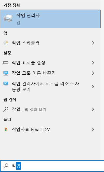 윈도우키를 눌러 다시 "작업 관리자" 입력 후, 작업 관리 화면을 띄워주도록 한다.