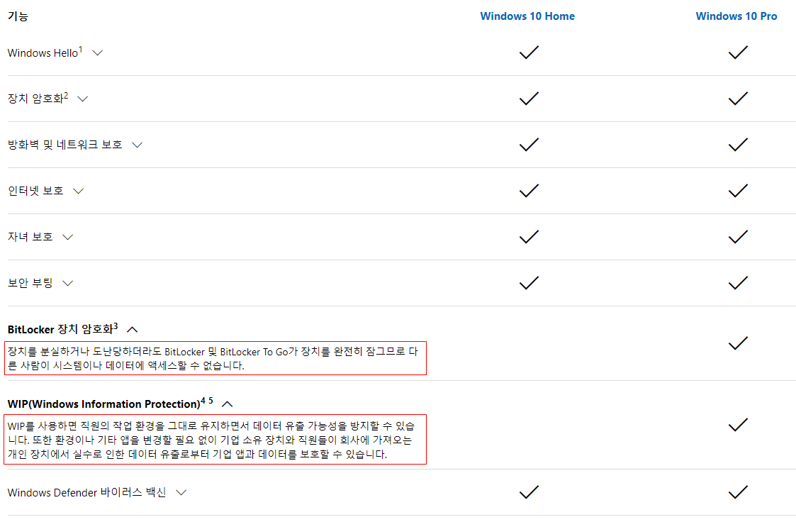 기능으로 구분하자면 윈도우10 Pro 에서는 비트로커 지원과, WIP(Windows Information Protection) 기능이 또한, 원격 데스크톱의 경우 윈도우10 Pro를 선택하여야만 지원된다.