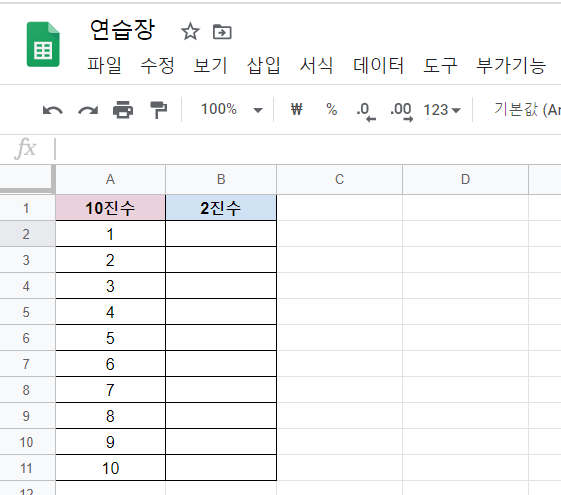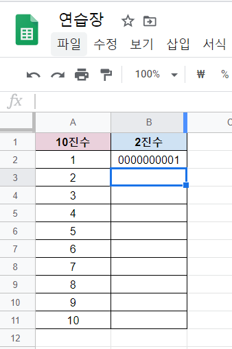 자 A열에는 10진수의 값을, B열에는2진수의 값을 입력할예정입니다