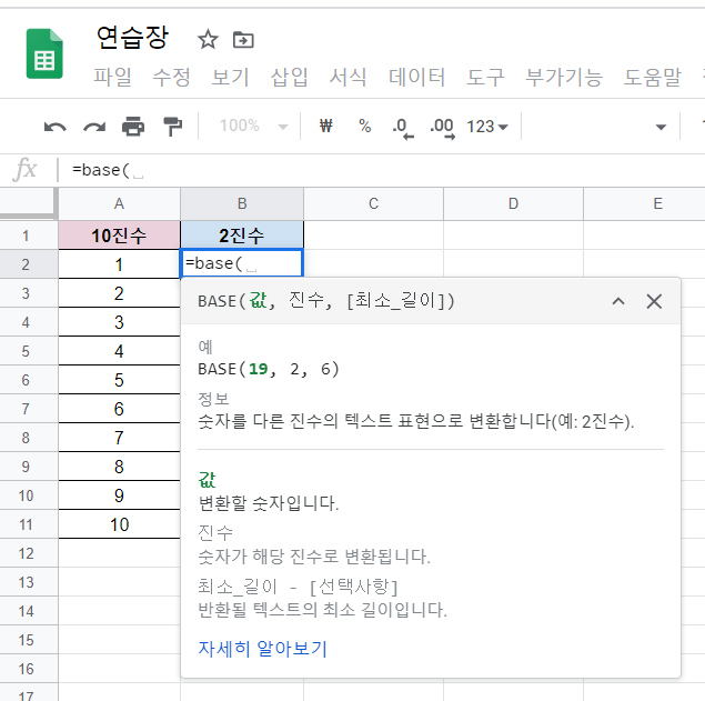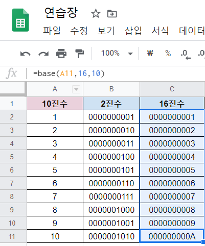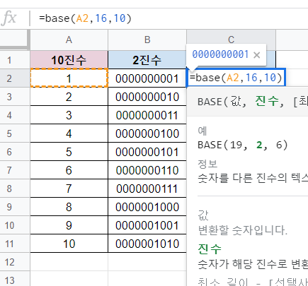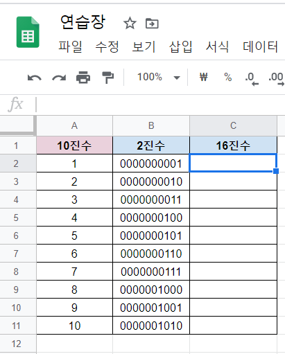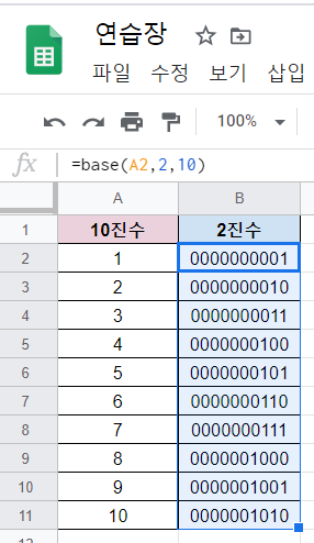 예시로 우리는 A열의 값들을 2진수로 변환하고, 10자릿수로 나타내 표현하도록하겠습니다