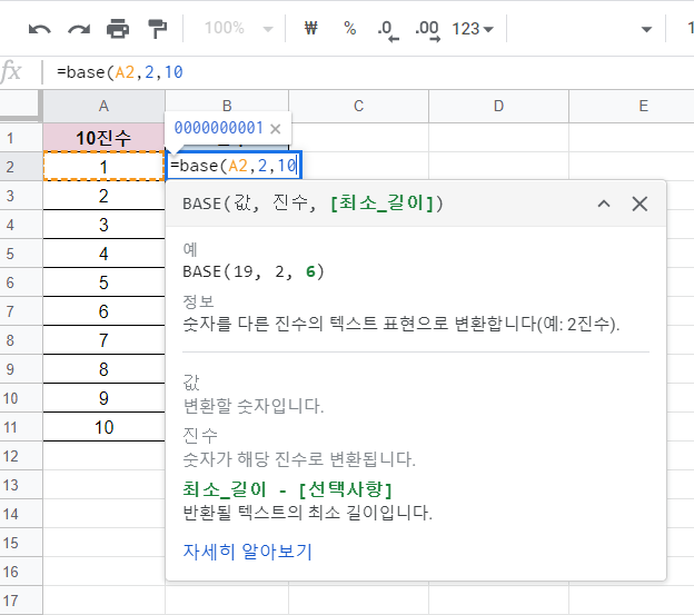 여기에서 값은 A열의 수치가 되겠고, 진수는 몇진수로 변환할것인지, 그리고 최소길이란 몇자리로 표현하여 변경한진수로 나타낼것인지 를 입력하는것입니다.