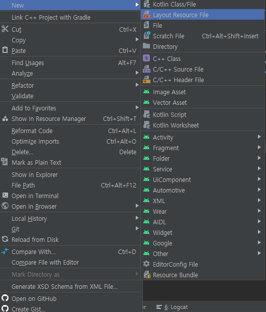 레리아웃 리소스 xml 파일을 "activity_sub_add" 명칭으로 만들어 준다.