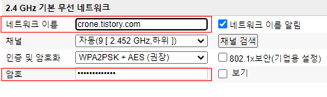 네트워크 이름은 무선 네트워크를 사용할 디바이스에서 해당 와이파이를 찾을 때 사용할 이름을 적으면 되겠다.
