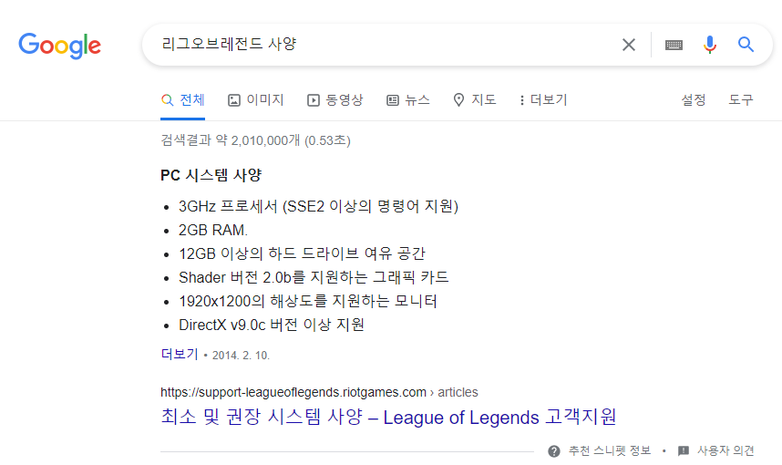위와같이 프로그램명과 사양 이라는 단어를 검색창에 입력하게되면 간단하게 나마라도 사양확인이 가능하다.