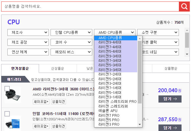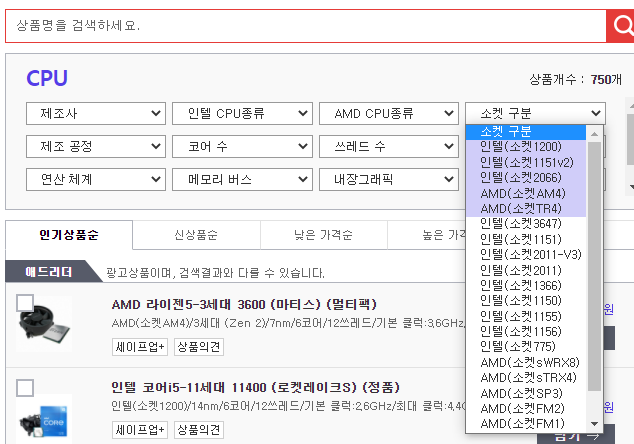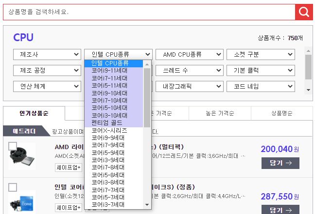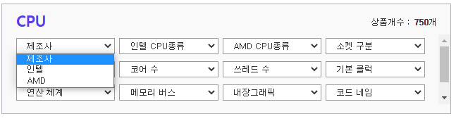 제조사, INTEL 세대 또는 AMD 세대 로 구분되어있으며 해당 모델중 자신이 사용할만한 소프트웨어와 가장 잘 맞을법한 CPU를 고르도록 하자.