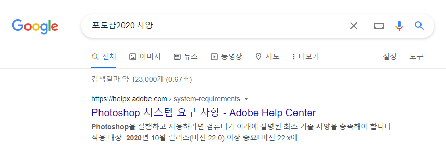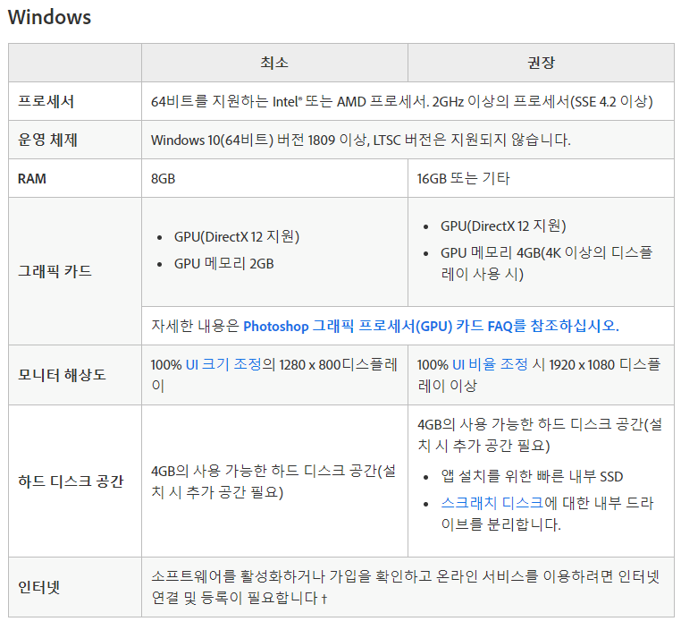 아래는 포토샵 2020버전의 최소사양과, 권장사양이다.