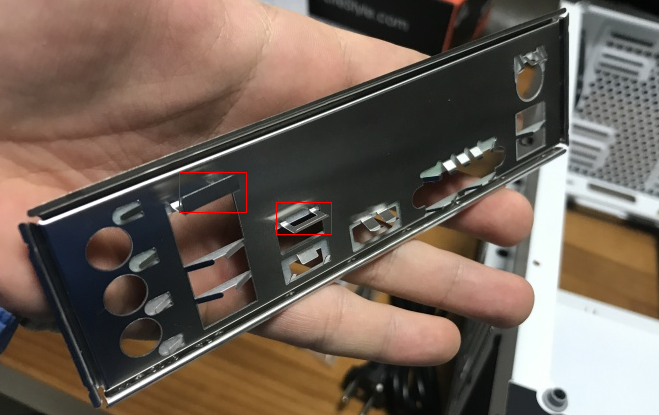 IO쉴드 뒷부분에 보면 위와같이 접히는 부분이 있는데 이는 메인보드 장착에 있어 방해가 되므로 반드시 꺾거나 접어주도록 하며 방향은 스피커,마이크 단자가 있는부분이 아래가 되도록 케이스에 장착하여 주면 되겠다.