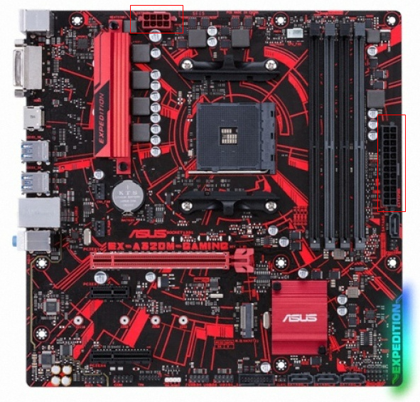위의 제품은 ASUS 의 A320 제품이다, INTEL이든 AMD 제품군이든 원리는 같다. 위의 네모부분은 CPU의 전압공급 부분으로 4포트 또는 8포트로 구성되어있으며 파워서플라이의 4+4 핀으로 구성된 8핀짜리 또는 4핀짜리를 해당 포트에 잘 연결하여주면 되겠고, 우측의 네모 영역은 메인보드의 전압 공급영역으로 24핀으로 구성되어있으며 파워서플라이에는 이 포트가 딱 하나밖에 없으므로 찾아서 연결하여 주면 되겠다.