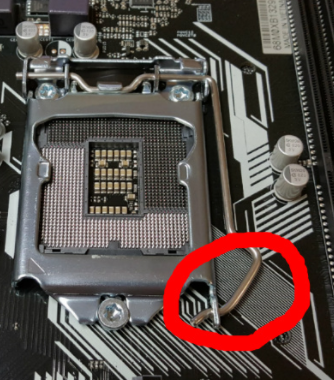 AMD 와 마찬가지로 걸쇠가 있고 해당 걸쇠는 들어올리면 AMD와는 다르게 CPU 걸이 덮개도 같이 들어올라 가게 된다.