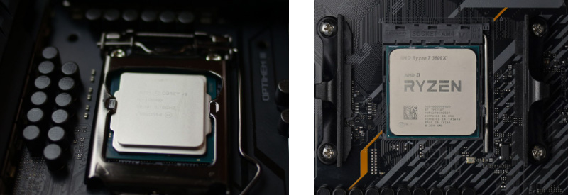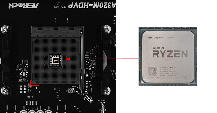 좌측은 메인보드, 우측은 CPU로 방향은 위와 같아야 한다, 또한 소켓이 자연스럽게 맞게 설계되어있기 때문에 힘을주거나 압력을 가하면 CPU의 핀이 손상될 수 있으므로 절대 힘을주거나 하지않고 위에 살짝 걸쳐 얹어주면 되겠다.