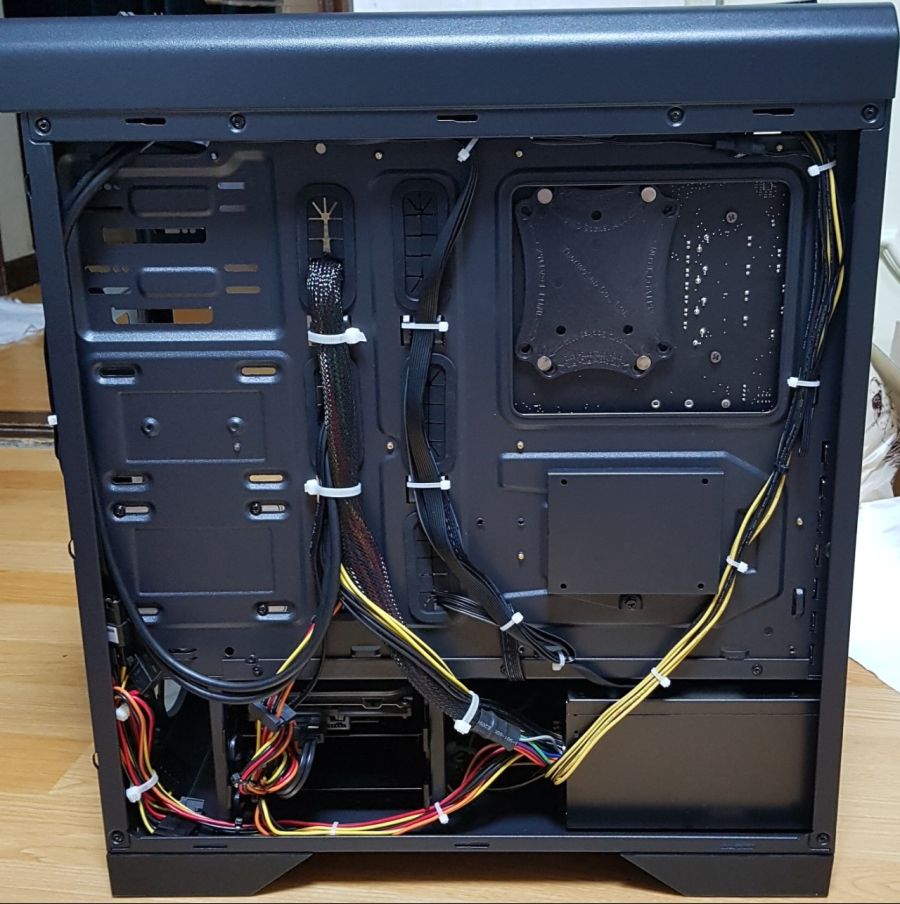 케이블타이를 이용하여 파워서플라이 또는 SATA케이블 등 기타 연결되어있는 케이블 선을 덜렁덜렁 거리지 않게 잘 고정시켜주면 되는것이다, 사실상 깔끔하게 선정리를 하면 보기에는 좋으나 너무 타이트하게 정리하게되면 반대로 케이블내에 전선이 탈락될 수 있으므로 적절한 수준에서 정리하는 것이 가장 바람직하다.